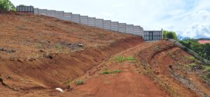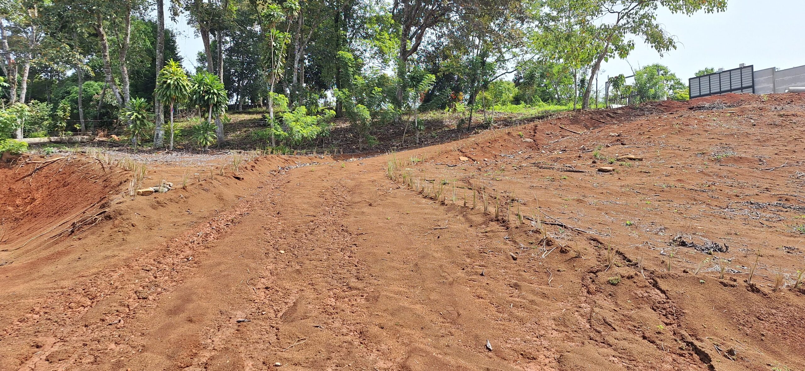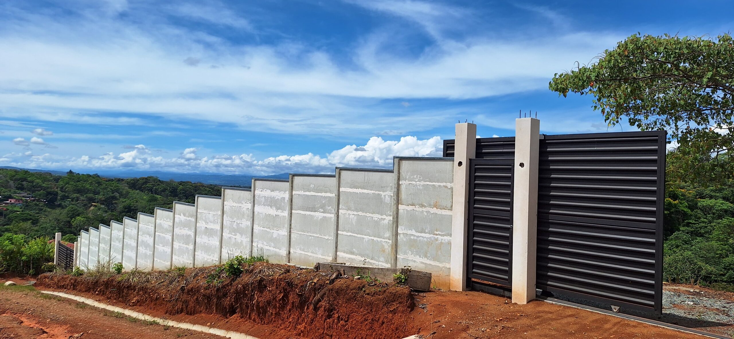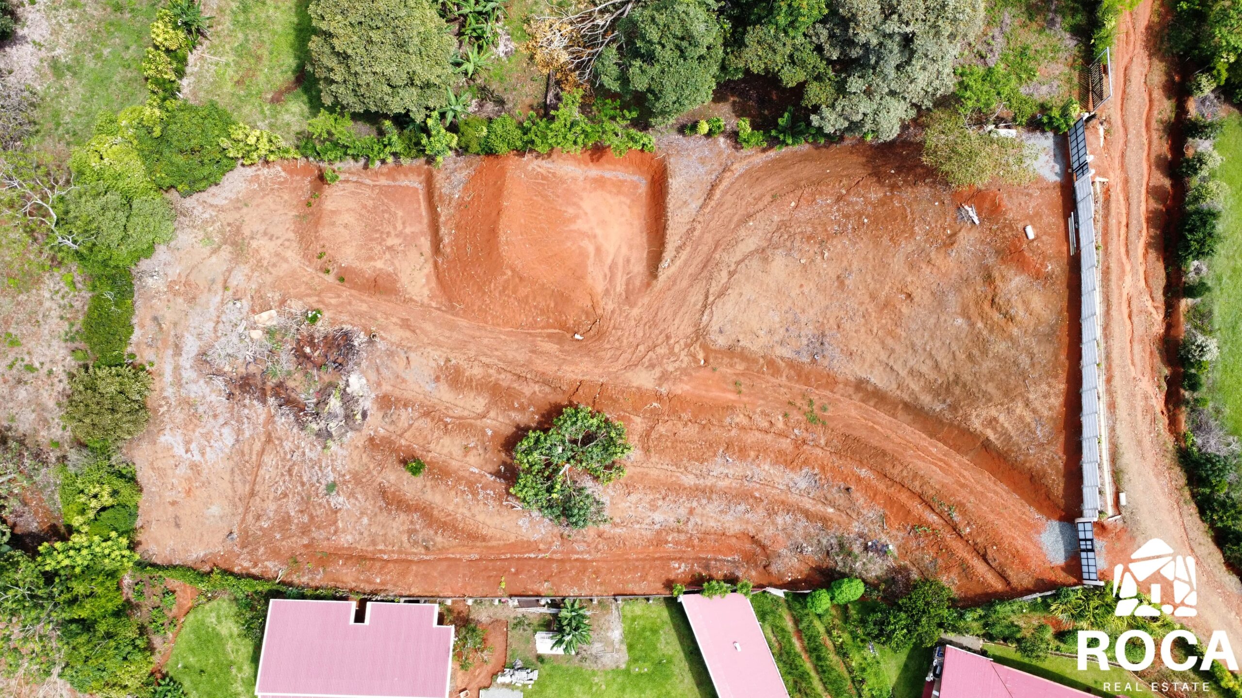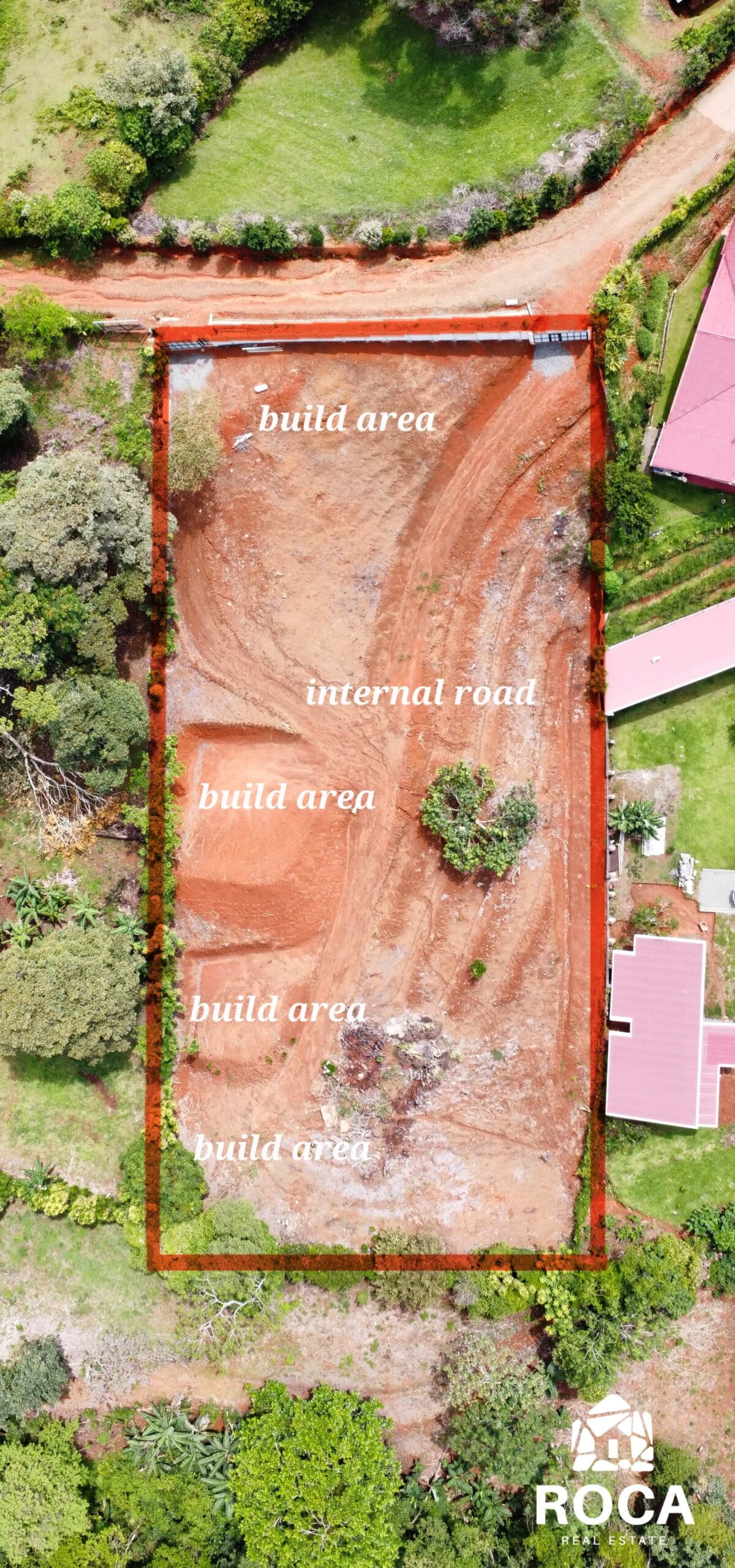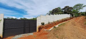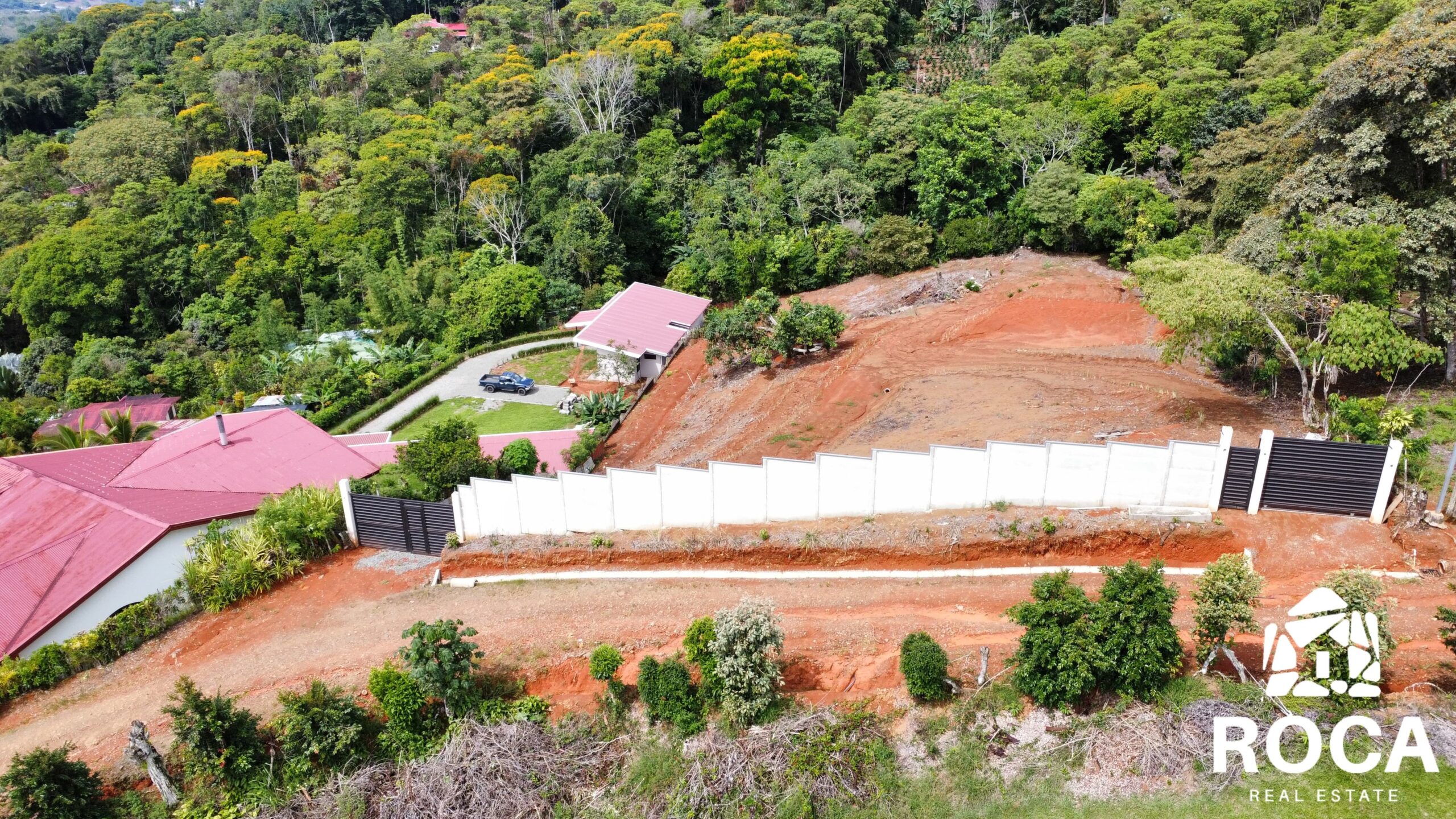 Key points: - It has several flat areas and an internal road. - Access to public services of water and electricity. - The property has a large front facing a public road. - Front wall with two access points, each with a gate.